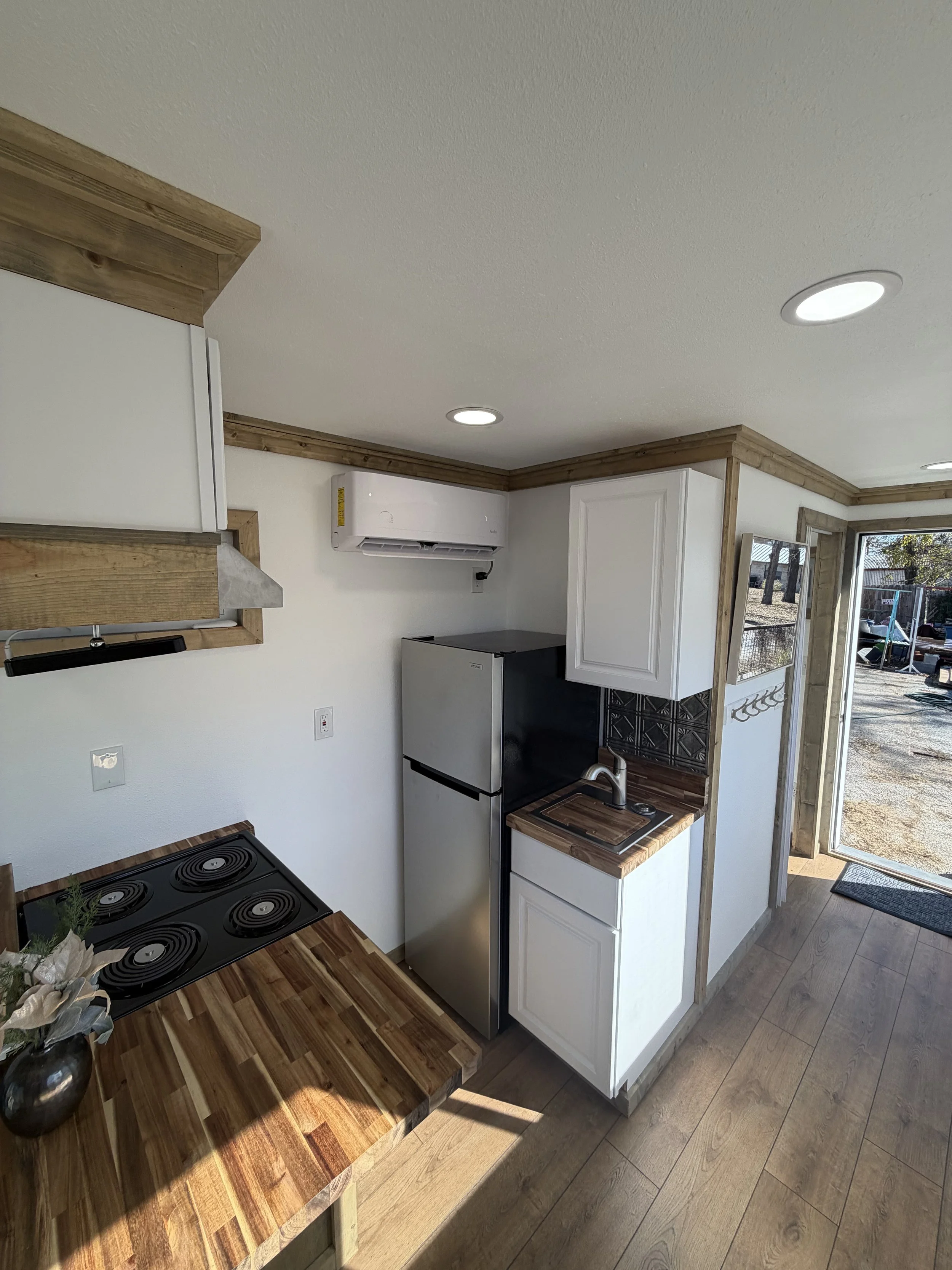 Compact HVAC options: ductless mini-split heat pump for heating and cooling, plus ceiling or wall-mounted fans.